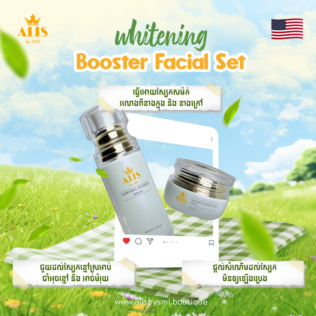 ការប្រើប្រាស់ : បន្ទាប់ពីលាងមុខរួច លាប Whitening Booster Serum ពេញផ្ទៃមុខ បន្ទាប់មកលាប Whitening Booster Cream លើផ្ទៃមុខ។ ធ្វើម្តងទៀតទាំងយប់ទាំងថ្ងៃ