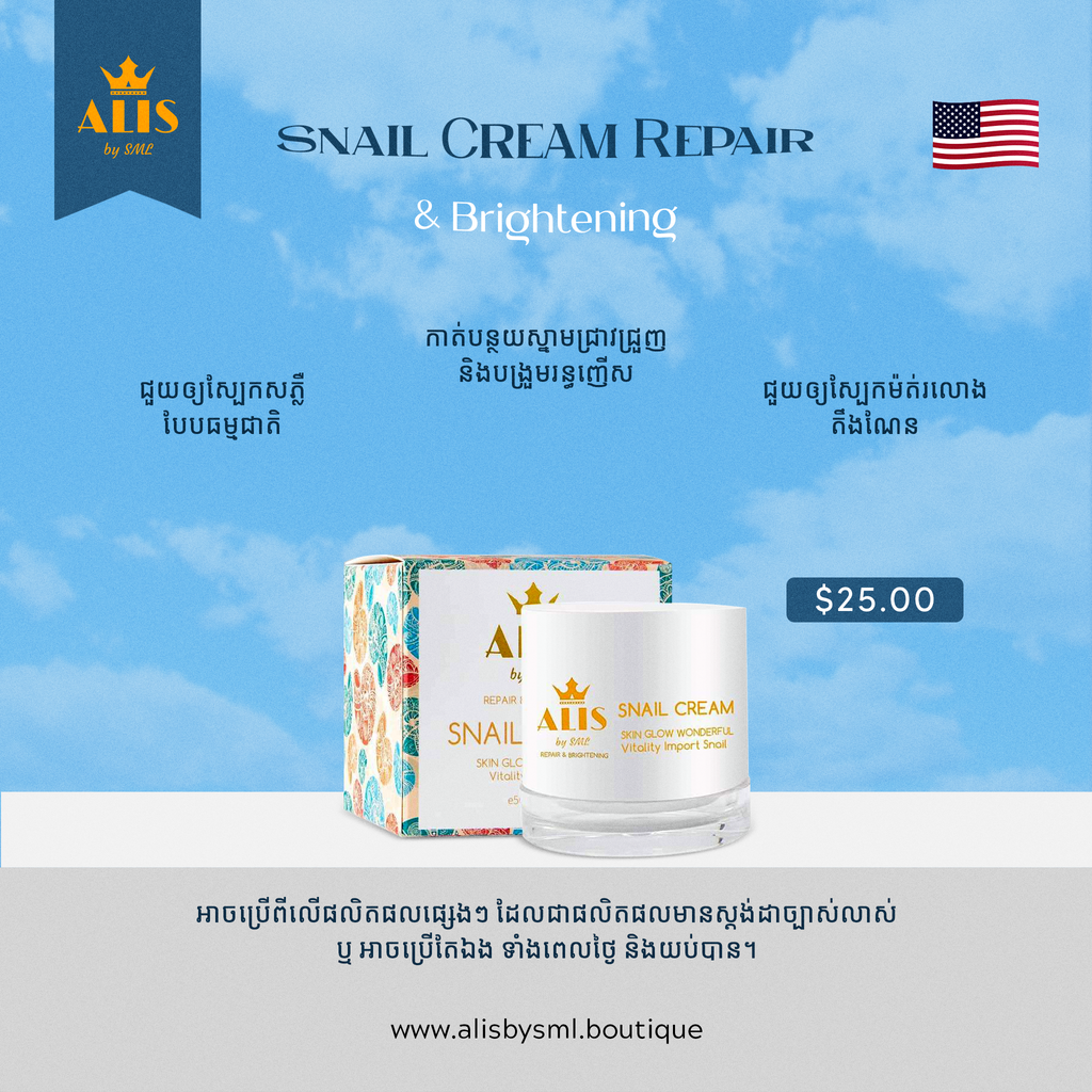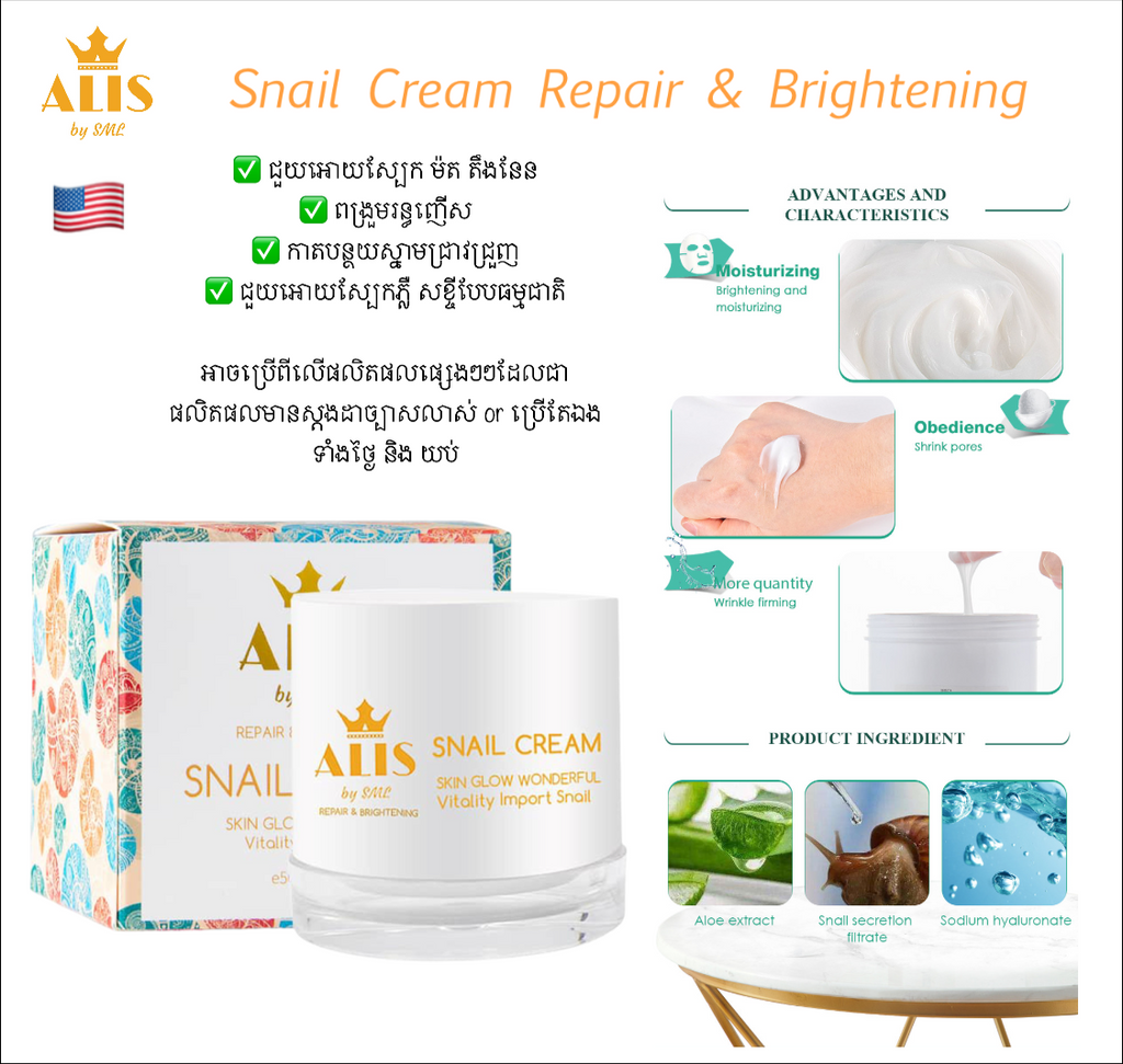 This cream is made from Snail and multiple Vitamins to repair your skin tissue to look glowing tightening , string pore , firm and whitening