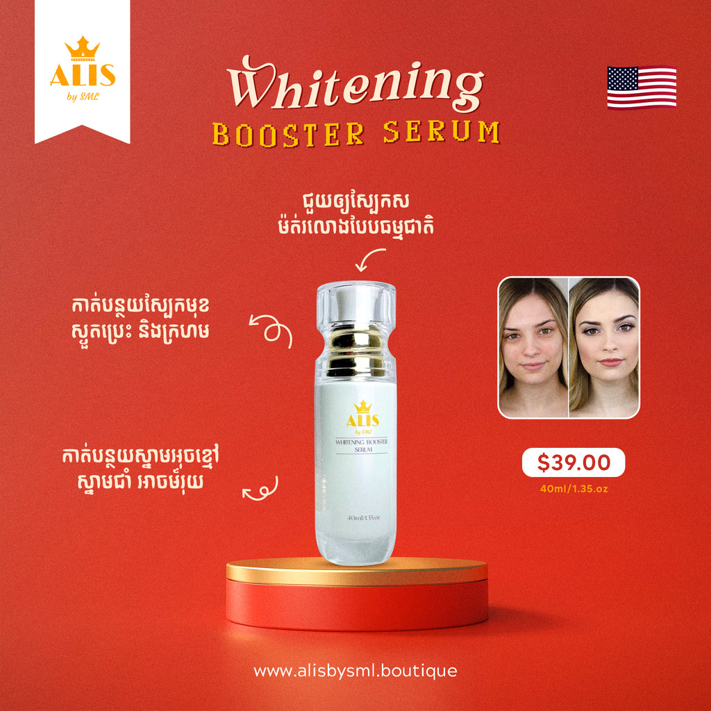 ការប្រើប្រាស់ : បន្ទាប់ពីលាងមុខរួច លាប Whitening Booster Serum ពេញផ្ទៃមុខ បន្ទាប់មកលាប Whitening Booster Cream លើផ្ទៃមុខ។ ធ្វើម្តងទៀតទាំងយប់ទាំងថ្ងៃ