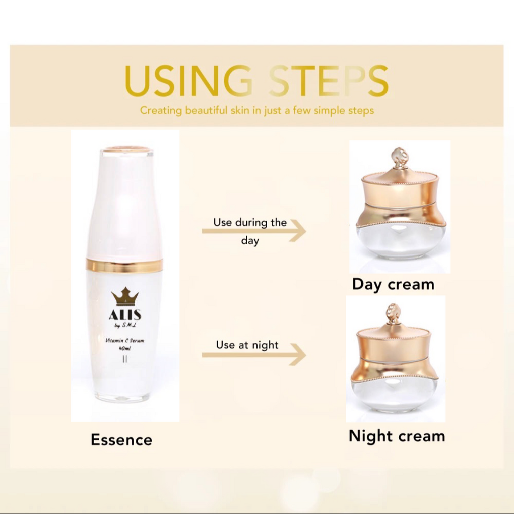 Use: nighttime 👉 after cleanser use Vitamin C serum then night cream ( yellow material ) , Daytime 👉 repeat the same as nighttime except night cream switch to day cream ( white material ) instead .